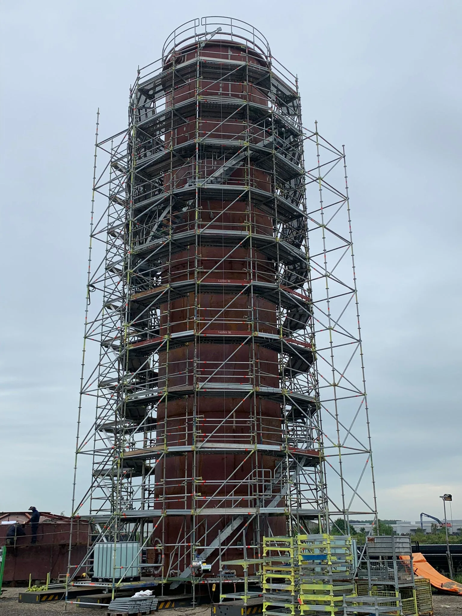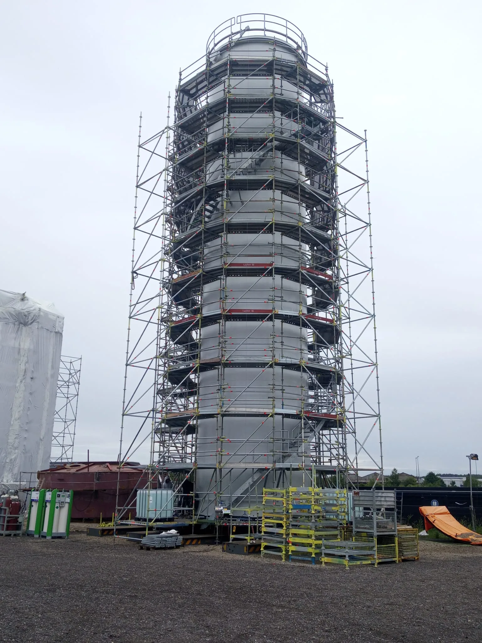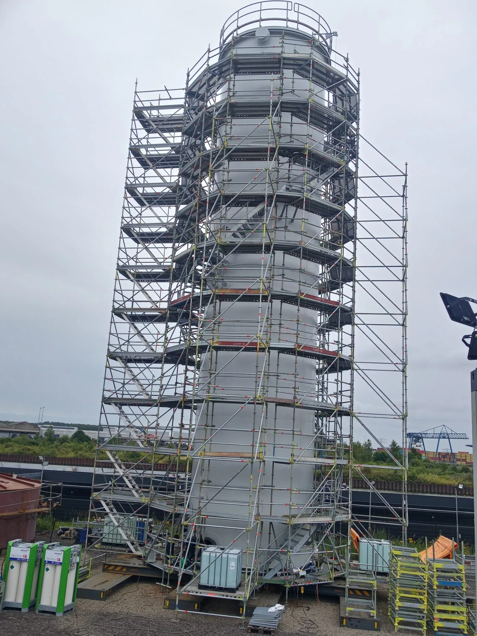 Voor een van onze opdrachtgevers hebben we deze 20 meter hoge opslagtank geconserveerd. De tank is gereinigd en voorzien van 2 lagen epoxy coating waarna de appendages en het dak zijn geschilderd in een polyurethane aflak. De wanden van de tank worden voorzien van isolatie vandaar dat deze niet worden afgelakt.
